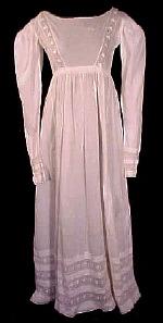 #1625 - c. 1820 White Cotton Embroidered, Tucked and Cutwork Gown in Grape Design (Jane Austen Era) So did you see the Pride and Prejudice miniseries...or the movies Sense and Sensibilities or Emma? If not, run, don't walk to the nearest video store and rent them! Trust me!!! Those are definitely the best Jane Austen adaptations in my book. Oh wait, I forgot... I'm not a movie critic, I'm sorry, but I just had to let you know! So, now that I've got you in the right frame of mind, take a look at the dress to the left. I used to only like the most elaborate gowns until fairly recently. Perhaps it was the movies, I don't know. Whatever it was, I became enamored of the clean classic lines of these early gowns... not to mention the awesome feeling of owning a piece 180 years old! This gown fits on my junior size mannequin (30" bust)... but please if you want to play dress-up, please only do it for a photo op... can you imagine the horror of spilling wine on this?? Very Good condition for a gown this age. Nice and white, Strong fabric. Has pin and bebe sized holes mostly near the bottom of the dress and a lovely old "L" shape darn/repair. Gorgeous details on the bodice, hemline and cuffs! Full upper sleeves. Empire waistline. Hook and eye under-bodice closure and little tie outer-bodice closure. (note: the little mark you see on the upper bodice is the mannequin - not the dress!) Don't pass up this opportunity.