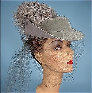 SOLD#6404 - c. 1938 I. Magnin, Custom Made Felt and Velvet Two-Tone Gray "Three Musketeers" Hat with Ostrich Feather! Ok, I know that calling this my "Three Musketeers" hat is really stretching it... but something about it evokes a cavalier Musketeer (no, geez... not the Mickey Mouse kind)! That would have ears! :) Anyway, it's an interesting shaped hat with turned up brim at back which shows off the other color gray velvet. The top is more a greenish gray. The underside is more of a blue-hued gray. The multi-toned gray large ostrich feather ties in both colors. The large gray netting is tied at back for dramatic effect. Nice stylized felt ornament at back. Condition on this hat is very good.... there are a few issues. The upper gray velvet is a bit dirty so shows a bit of moddled look. The netting is nearly perfect. Will sit on top of your head and it's very comfortable (perhaps even a bit on the larger size) on a 22" normal sized head. Measures: 10" x 10" x 6" tall. Looks really pretty on! $ 185. SOLD
