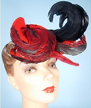 Click on image for additional photos!#6274 - c. 1943 GEORGE BEIGEL, Paris Glorious Red Felt "Doll" or "Toy" Hat Trimmed in Shaded Red and Black Rooster Feathers! All Original! OK all you gals who love 1940s doll hats (no, these aren't for dolls... but for fully grown women... it's just the name given these tilt-top hats of the late 1930s and 1940s)! I was lucky enough to get a few superb ones recently... so... don't hesitate. Once they are gone, they are gone! And wouldn't it be nice to have them come live with you? This one is a red felt curvy base doll hat with rare attractive headband which can be worn over or under the hair. The hat is a Parisian import - no surprise - unique and very fashionable arrangement of the shaded red and black rooster feathers. Exceptional design!! Excellent condition...even comes with the original red felt hatpin (you will see a bit of pin at back photo). Worn on top of the head, so will fit anyone.