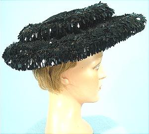 Click on image for additional photos!#6572 - c. 1904 POUYANNE, Paris Black "Greek Net" with Bands of Trembling Oval Paillettes! From the prestigious Rue de la Paix, Pouyanne was one of the premier Parisian milliners of the Victorian / Edwardian eras! I have not seen another like this one from this era! A two tiered round large hat nearly completely covered with black oval paillettes (or large teardrop shaped sequins). I wish I had had this hat prior to selling what seems to be a matching gown Redfern gown (see it at http://antiquedress.com/item4722.htm). If this hat was in excellent condition, I would easily more than double the price, but as it is, it is "messy" in some areas. That's the best way to describe it. The paillettes were meant to be "trembling", so they weren't sewn on tightly when new, but they just seem worse for 100 years later. For such a rare, Parisian designer hat... I hope you allow for the condition, and still fall in love with it as I have! From Museum Collection