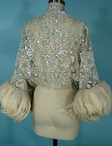 SOLD on LAYAWAY# 6596A - c. 1984 Sheer White Lace and Auroraborealis Sequined Evening Shrug with Huge Feather Sleeves from the Estate of Hotelier LEONA HELMSLEY! I purchased a few of the "over-the-top" gowns from the legendary Leona Helmsley - "Queen of the Mean" as she was known. With her wealth of over $5 Billion Dollars... she was one of the richest women in the world in the 1980's! Most of her gowns were custom made for her “by Julia,” the personal, full-time seamstress who designed on dress forms in a separate wing of Helmsley’s opulent living quarters! As you will see, “She obviously was the epitome of a rich socialite, wanting to stand out in a sea of black." SO.... Yup.... I had the original feathered hem gown that went with this shrug and had purchased this at the same auction, but I lost this shrug for a few years. It just resurfaced! AND I have just found the original Helmsley Palace Ad with Leona wearing this piece!! The ad was from 1984, so it's absolutely a dated piece. NOTE: I am showing a photo of the gown I had already sold (just so you can see it), and I photographed this shrug over another gown, but this is ONLY for the feather cuffed shrug. Excellent condition. And WHAT a WOW factor!!! $ 585. SOLD on LAYAWAY Approx. - SIZE small