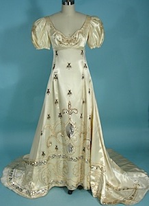 # 7657 - c. 1998 The Man In The Iron Mask MGM/UA Movie Costume In the Style of c. 1670 French Fashion! Screen-worn Off-the-Shoulder Trained Gown! Movie Starred Leonardo DiCaprio and Worn by JUDITH GODRECHE! HIGHEST QUALITY COSTUME! Never has anyone looked more beautiful on-screen than Judith Godreche in this off-the-shoulder ivory silk brocade gown! She is not enjoying a candlelight dinner with Leonard DiCaprio (King Louis XIV), but man she is gorgeous!!! You can see the photos if you click on this gown, or if you want to watch a clip from the movie, see below. Huge balloon sleeves with lace cuffs, long torso and extreme full skirt with the glorious bodice embroidered with gold lace trim and pearls. Comes with the screen-worn pair of cream-colored opaque stockings and a bag of assorted trims and lace. Accompanied by a DVD copy of the film. This gown was also worn in the subsequent suicide, but luckily she didn't hurt the gown! This is THE gown worn, as you can notice the same few pearls missing from the upper back in the movie clip! Excellent condition (though not absolutely perfect, still nothing worth even mentioning) and includes minor issues (any seamstress can fix in a few minutes) including the back skirt seam is undone. Why? Who knows, but it's a simple fix. You will want to purchase a Renaissance hip roll underpinning and a huge slip for the gown to look like this (they are not expensive online). Measures: 30/31" bust, 24" waist, 43" long skirt from natural waist, 62" long skirt from waist in back. NOTE: the back closes with hidden corset ties. Since it's quite a small size, if you are planning to wear this, you may need to increase the size so you can use the extra laces and trim to do what is needed. Get creative. It's do-able!!!! Definitely wearable for a wedding gown!! Extra Shipping Charges apply. FINAL SALE MEMORABILIA ITEM. Approx. - SIZE 0 (but can make larger at back to size 2/4 with small waist)