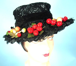 SOLD# 5298 - c. 1950's Black Raffia Straw Hat with Large Cherries (or Cherry Tomatoes!) Owned and Worn by ANITA LOOS! Love this one. Excellent condition though it's squashed when off the head (see photos). I'm hoping that the right person will know how best to steam the hat to unsquish. It's worth the effort. Lovely shape and those ornaments are killer! :) Final Sale Movie/Memorabilia piece. $ 645. SOLD