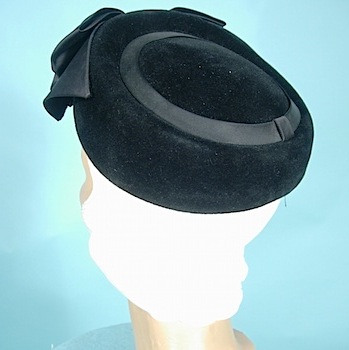 SOLD# 5309A - c. 1960's Marlea Hats, New York - Baltimore Black Velvet "Flying Saucer" Hat! Owned by ANITA LOOS! I mean what else would you call this shape beside flying saucer?? Black velvet with gathered crown and rope bow at back. Stiff shape hat. Excellent condition. Final Sale Movie/Memorabilia piece. $ 185. SOLD