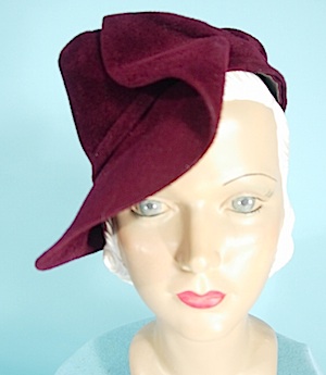 SOLD# 5283 - c. 1930's Deep Wine Felt Hat Owned and Worn by ANITA LOOS! Wonderfully wacky... one side looks like a typical 30s hat, the other side more like a modified beret, and like a newsboy cap from another angle. Just the kind of design you expect to find in a designer hat, but alas... no labels. Just a great 1930s hat! Some of the photos are brightened to show detail. Excellent condition. Normal 22" size. SOLD