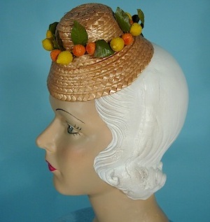 SOLD# 5233 - RARE c. 1960's Tiny Natural Straw Hat with Tiny Oranges and Lemon Fruit Owned by ANITA LOOS! Anita Loos LOVED these tiny, barely there hats! Some people might call them Salesman Sample hats, or even doll hats, but from what I can gather, these were meant to be worn even though they look so small it's hard to believe. But from the photograph of Ms. Loos wearing the white flower tiny ball hat, these ARE real hats! Ms. Loos had quite a few of these tiny mini hats, many from Bergdorf Goodman. I've been searching for other photos of Anita in the rest of the hats, but sadly haven't found that many photos of Ms. Loos during this era. I'm lucky to have the TWO photos of Ms. Loos in the white floral tiny hat I got in this collection!! That hat has been SOLD. This one is a natural color straw hat (in the shape of a bucket hat) with great oranges and lemons and leaves. Excellent condition. Would need a hat pin to stay on. Final Sale Movie/Memorabilia piece. $ 545. SOLD