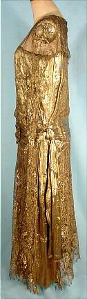 #0004 - c. 1929 S&J.B. Paris, New York Gold Lame and Gold Bullion Lace Evening Gown with Attached "Scarves"! Now, I will let you in on the secret of my numbering system. As you can see, this item is number #0004, which means that it has been in my collection for many, many years! But every once in a while, I feel it's my "duty" to offer you up some of the items that haven't seen the light of day for decades! I'm a total sucker for the REAL gold lame... there is just no comparison to the cheap stuff they sell today. This gold shines like the real stuff... and I was once told that indeed this old lame IS spun with gold. Gold lame slip under and totally covered, except open at the sides, with gold lame lace. Gold lame sash attached. Measures: 35/36" bust, 53" long from shoulder to hem. I added a goldtone pin at the waist on the sash, but that is my pin... I'm sure you have one of your own that would work as well. Would have been a very expensive gown when new... with the Parisian, New York label. Excellent condition!