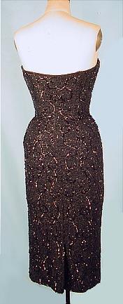 #1708 - c. late 1940's, early 1950's CEIL CHAPMAN Black Beaded and Sequined Cocktail Dress with Tulle Bodice! Ceil Chapman was one of Marilyn Monroe's favorite designers and often used in vintage Cadillac ads! And her gowns are getting more and more popular as investment pieces... and for a very good reason. They are beautifully designed to hug every curve of a woman's body! I keep an eye out for the best Ceil Chapman dresses and gowns, and have never seen another fully beaded/sequined cocktail dress, so you know this is special. Side metal zipper. Mid-calf length. Boned bodice with that ever-so-sexy tulle bustline! Fits my dressform perfectly at 35" bust, 25" waist, 36" hips. Excellent condition. The "scarf" is just a bit of tulle, and is not included.