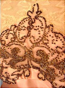 trimmed neckline. Bronze metallic seed-size beadwork at the