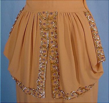 fabric with her signature draping. Gold sequin trim. Side metal