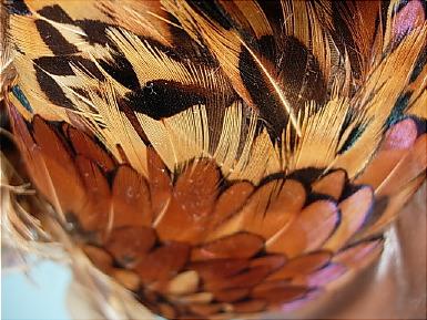 sitting in a bird's nest atop this pheasant feathered head-wrapped