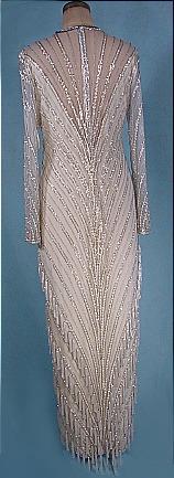 #3454 - c. 1980's BOB MACKIE White Beaded Tasseled Gown! I don't think I have to tell you about Bob Mackie. If you have been alive for the last 30 years, you will know him! What you may not know is that the quality of his goods sold today are a far cry from the quality of his goods from his early years of designing for the fashion industry. I only purchase the old Mackies....the gowns beaded directly onto a sheer, but strong netting, and then lined in a removable silk lining. These are direct knock-offs of his theatrical designs for the likes of Cher. However, she would wear them with no lining! You can too, if you dare! Labeled size 12, but it's smaller in today's sizing. Zipper cuffs. Zipper back. Excellent condition with only 3 tassels missing that I see. One tiny, tiny nude color mark on sleeve. Picky! It's really near Mint. Originally sold at high-end boutique shops, this gown includes extra bag of beads and one extra beaded tassel and the original hand-written price tag of $1550. This is a top-of-the-line collectable Mackie!