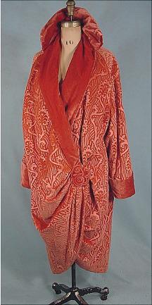 #3628 - c. 1919 Imported by I. MAGNIN & Co. Coral Embossed Cocoon Velvet Evening Wrap Coat! Imported. I'm sure that doesn't mean from anyplace but Paris! And it's certainly that incredible that you'd expect it to be from Paris. A coat to make an entrance! A fine antique piece that will last forever - and nearly always be in fashion! Wanna jump on the bandwagon with the 20's look that is so popular these days? It's a rich "chinese coral" color in a gorgeous embossed deco design velvet. Fully lined in matching plain velvet. Possible that the velvet is cotton based which makes it heavier than the typical fluid silk velvet. Substantial coat! This one might actually keep you warm, as the thin silk couldn't possibly! Closure is a masterful twisted velvet design medallion. Collar can be worn up or down. Near Mint condition.