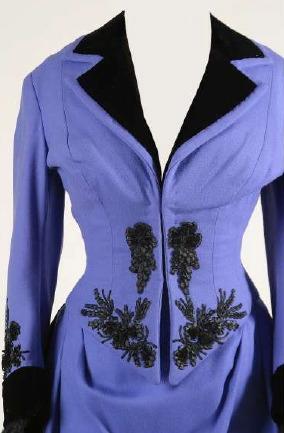 #3802 - c. 1987 Victorian Style Trained Bustle Gown designed by NOLAN MILLER for ELIZABETH TAYLOR's in "Poker Alice". Elizabeth Taylor's stunt double wore this Nolan Miller designed, beautifully detailed, 2 piece period costume in the 1987 TV romantic western "Poker Alice". The outfit consists of a skirt and jacket. The fitted, taffeta lined jacket is periwinkle blue wool with a black velvet collar, lapels and cuffs and a V-neck and front that comes to a point at the bottom. The jacket has an intricate black ribbon and velvet design. The initials E.T. are stitched on the waistband of the skirt. The fitted skirt is the same periwinkle blue wool as the jacket, lined in purple satin with a v-shaped piece in the front and back and black velvet on the edges with black ribbon detailing. Included is a photocopy of the costume in use, and a certificate of authenticity (COA) signed by Nolan Miller and Darren Julien. FYI, Poker Alice was a real woman who was a contemporary of Wild Bill Hickok and Calamity Jane! Measures: 15" seam to seam shoulder span, 22" waist (which could be made slightly larger), 39" long from waist to hem in front with a train in back,. 20" sleeve length. The auction estimate of $2000, would have cost you $2300+ with the buyers premium, so the price listed here is less than what Sotheby's would expect for this outfit. An investment piece of Liz Taylor memorabilia., as well as a gorgeous Victorian Style Trained Bustle Gown in Excellent condition!