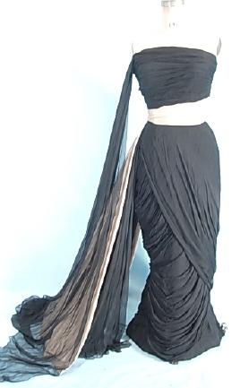 #4073 - c. 1950's Couture FALKENSTEIN Black Silk Chiffon and Champagne Colored Taffeta Grecian Gown! Wow! Top of the line! Exquisite design by Arthur Falkenstein. Falkenstein opened his atelier at the Hotel Meurice in New York in the 1930s. At first he purchased models from Paris and copied them, but by 1941 he was designing a wide gamut of clothing from smart suits to glamorous evening gowns. His designs rivaled the greatest American couturiers of the time including Hattie Carnegie, Sophie of Saks and has the look of a Parisian Jean Desses. The gown is black taffeta topped with black chiffon draped and wrapped around a narrow skirt. There is an explosion of (removable) champagne colored silk taffeta and black chiffon off the right waist. The bodice is strapless with long chiffon scarf falling from the left shoulder to the ground. Side metal zipper. This gown is best for posing... not easy to wear. Measurements: 33" bust, 25" waist, 35" hips, 41" long from waist to hem. Excellent condition. However... other than 5 smaller than matchhead sized graduated holes (in a line) in the attached scarf, there are some holes and some repaired holes to the draped chiffon at the hem area. These were not seen until full inspection. They are unavoidable on a gown like this.. as they come from walking/heels. You won't see them under normal conditions. Other than the fact that the zipper will need a quick machine stitching, the gown is still in remarkable condition for such a rare chiffon designer gown!