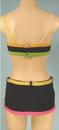 #4086 - c. 1960's RUDI GERNREICH Black Wool Knit Skirted Bikini Trimmed in Gold, Yellow, Green, White and Pink! Own a little piece of fashion history with the purchase of this vintage two piece swimsuit designed by Rudi Gernreich for Harmon Knitwear. As you likely know, Gernreich was featured on the cover of "Time" magazine in 1967. This great looking bathing suit is black knit. The suit has a orange knit band along the top and a green band along the bottom, with one yellow strap and one white strap, which buttons up the back with two buttons. There is a little skirt over the swimsuit bottom, which has a yellow knit belt that ties and along the bottom edge of the skirt is a hot pink band. There are two small stains on the back of the pink band and slight dirty spot on the belt. It's amazingly adorable on! And it's a museum collection piece for a Rudi Gernreich retrospective.
