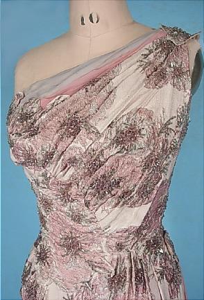 #4259 - c. 1950's Finely Woven Rayon Floral Beaded and Chiffon Gown! They don't get much more beautiful! Nor do they get more perfectly designed! Note: I usually like to only sell items in Excellent to Near Mint condition.. that means fresh, crisp, like new fabrics. The fabric on this gown just seems to be a bit "tired". That's the best word for it, There are NO stains, rip, tears, or discolorations, .... just has the patina of age. The fabric is unique, so perhaps it's meant to have that "old world" look about it! Made in a silvery rayon (?) fabric with old rose and silver lame clusters scattered thruout, with smoky bugle beads clusters in the centers. Dramatic one shoulder strap with chiffon pleated layer at neckline and again at one side with wide expanse of chiffon in pink and gray. Back zip on pink rayon lining, with hook and eye closure at shoulder and again at side back. Now, please note... I had another similar gown years ago which had a Balmain label... so.... it's an assumption on my part that this may have been by Balmain.. and may have been a sample model, as the interior isn't well finished, and the draping is hand-stitched. Certainly with a design this spectacular.. it's "Somebody" important! Measures: 35/36" bust, 26/27" waist, up to 36" hips (tight on 37"!!), 55" from shoulder to hem. Many of the beads are sewn on loosly.. and again I'm not sure why, but certainly could be due to the possible sample gown theory!