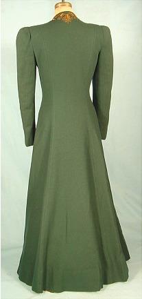 #4368 - c. 1939 WOOLF Bros. Hunter Green Wool Evening Coat with Copper Metallic Embroidery! I have NEVER seen a more beautiful 1930's coat! I can just imagine Katherine Hepburn in this piece. Beautiful hunter green wool. Princess lines. Just the start of the padded shouldered 1940's. And oh, what glorious copper metallic embroidery down the front from neckline to waist. Please look at the close-up photos of the embroidery! Easier than explaining. Measures: 34-36" bust, up to 30" waist, up to 38" hips, high underarms, fairly skinny sleeves, 59" long from shoulder to hem. Don't hesitate... buy it on layaway, or ask your boyfriend, husband, mother, sister, boss... anyone... to buy it for you!!!! Excellent condition. Fully lined. Meant to be worn fitted to to body, so don't expect lots of room like a modern coat.