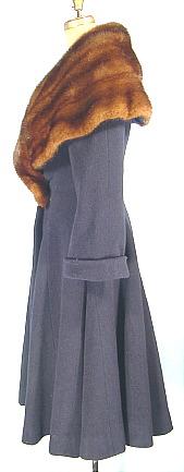 #4370 - c. 1953 PAULINE TRIGERE Heavy Dark Blue Wool Winter Coat with Enormous Shawl Mink Collar! Should I start by mentioning that in April 2004, a signature Pauline Trigere coat sold for $4,780!? These are things you need to know just to confirm how special this vintage coat is! Gorgeous dark blue heavy and padded wool coat with the "New Look" shape with wasp waist and full hips.... topped off by the enormous brown mink shawl collar! Cuffed sleeves are just turned up, but can be worn turned down as well. Fully lined and padded with an extra wool layer (with a bit of a fluffy feel) for extra warmth! Two buttons at the waist can be moved for larger waist size.. currently 34/35" bust, 25" waist, 48" long from shoulder to hem.. But if you use only one button at waist to close, and pull the mink collar tighter around, you can fit up to a size 8 with 32" waist.. and perhaps a 36/37" bust! (Remember you are wearing clothing under, so leave some room!!) But you'll probably want to wear this coat with a skimpy little dress for two reasons... one, so it will fit nicely under... and two, so you can remain "chilly" so you never have to remove your coat! :) The compliments will just keep coming! Excellent condition. Long waisted, and full, so best for taller gal.