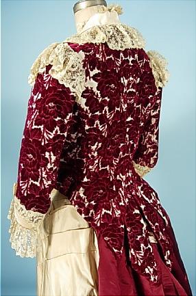 #4691- c. 1882 LEVILLON, Paris Burgundy Façonné Floral Rose Velvet, Cream Satin and Alençon Lace Trained Evening Reception Gown! Wearable Size! One of the most expensive gowns I have ever purchased... so pay attention!! Glorious burgundy façonné velvet on a white satin background with light cream satin "apron" and real handmade Alençon lace (the most expensive lace in the world!) trim. From the Parisian House of Levillon, sold in London through the famous Debenham & Freebody Shop (founded in 1851) so both labels are present on the gown! Exquisite detailing, including the embroidered buttons to match the floral velvet of roses, the pleated detail at the hemline, and the floral velvet insets in the burgundy silk train. The REAL Alençon lace is rare and expensive! Though that is the only real issue with the gown, the lace is quite fragile and has lace breaks... but it's 90% fine. The exterior gown itself is in near pristine condition. The interior lining at the top of the skirt has some tears from stress/weight... and the underlayer of the hemline (unseen outside) has wear. The gown would likely have been worn with garnet jewelry to match. Measures: 36/37" bust, 31" waist, 44" long skirt in front, 60" long skirt in back.