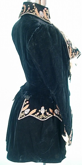 # 7348 - c. 1884 Arnold Constable, New York Black Velvet Embroidered Fancy Walking Jacket! More info coming soon! Measures: 32" bust, up to 29" waist, but small back so likely not wearable for modern sized woman.