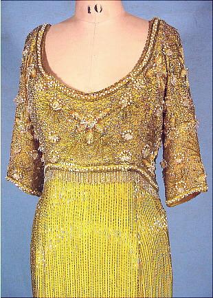 #9344 - c. early 1960's HELEN ROSE COUTURE Incredible Beaded Yellow Gown! You might know who Helen Rose was by now (if you read through my descriptions!), but if you don't, Helen Rose was one of the few top Hollywood designers from the 1940s-1960s. She costumed over 200 films for MGM and was honored with 10 Oscar nominations and two Oscar wins! Her most memorable designs were perhaps Liz Taylor's "Cat on an Hot Tin Roof" white wrap dres and slip, and Judy Garland's 1890s muttonsleeve gowns for "Meet me in St. Louis". But perhaps Helen Rose is best known for designing Grace Kelly's wardrobe for "The Swan" and "High Society" and, as a personal favorite, was selected to design Grace Kelly's personal wedding gown! Helen's consumer line existed from 1957-1972. Her beaded gowns sold for over $1,000 in the 60's! Gorgeous yellow silk gown fully beaded with silver bugle beads down skirt and elaborately beaded bodice with faux pearls, sequins, beads and hanging clear drops in low scoop neck and 3/4 length sleeves. Even has small loops of beads at bodice bottom for a little extra "kick" when you walk. Excellent condition! So... if you are planning to win an Oscar nomination, you will need an Oscar caliber gown!! You will want wide shoulders for this dress! Nearly perfect... and certainly museum/collectable worthy! Looks AMAZING on!!!!